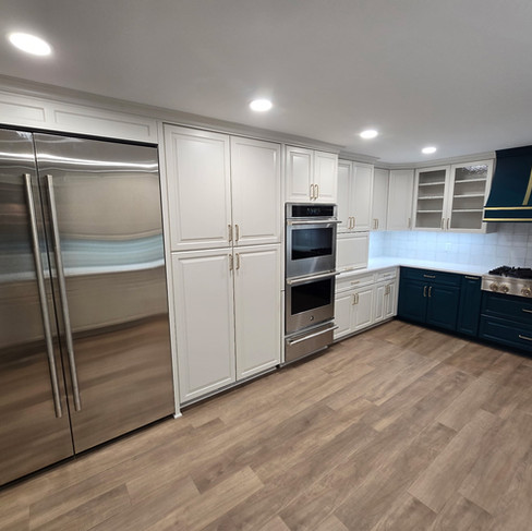 Our clients had spent years with a kitchen with a cramped layout, ineffective ventilation, and dated finishes. Their current kitchen lacked storage and usable counterspace, and with their washer and dryer located right off the kitchen, we needed to find a way to make everything more functional, add more storage, but they also knew they wanted color!